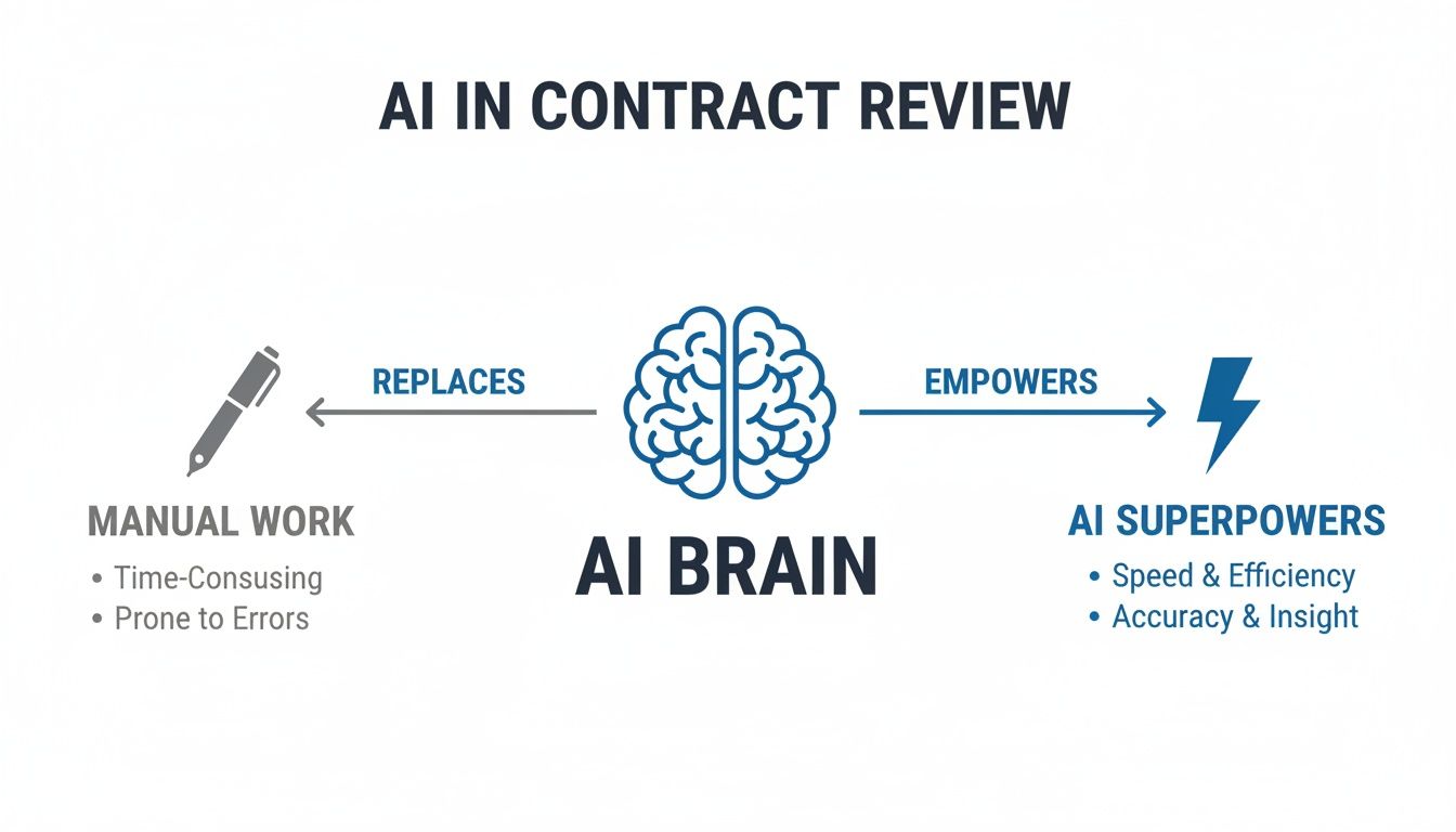 Think back to the old way of reviewing contracts. Remember the endless nights, the tower of coffee cups, and that nagging fear of missing one crucial clause hidden somewhere in a 50-page document? That high-stakes, manual grind is quickly becoming a thing of the past. AI for contract review isn't some far-off idea; it's a very real and essential tool for legal teams, business owners, and paralegals right now.