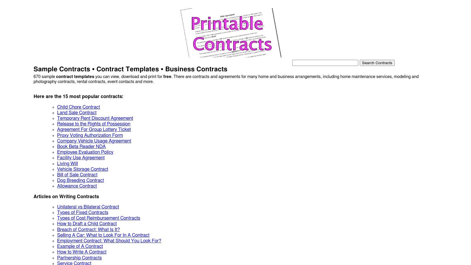 PrintableContracts.com lives up to its name by offering a straightforward, no-frills source for over 600 sample contract templates. The platform is designed for users who need a basic business contract template free of charge, without the complexity of signing up for an account or using an online editor. Its core strength is providing simple, plain-language documents that are ready to download, print, and fill out by hand for immediate use.