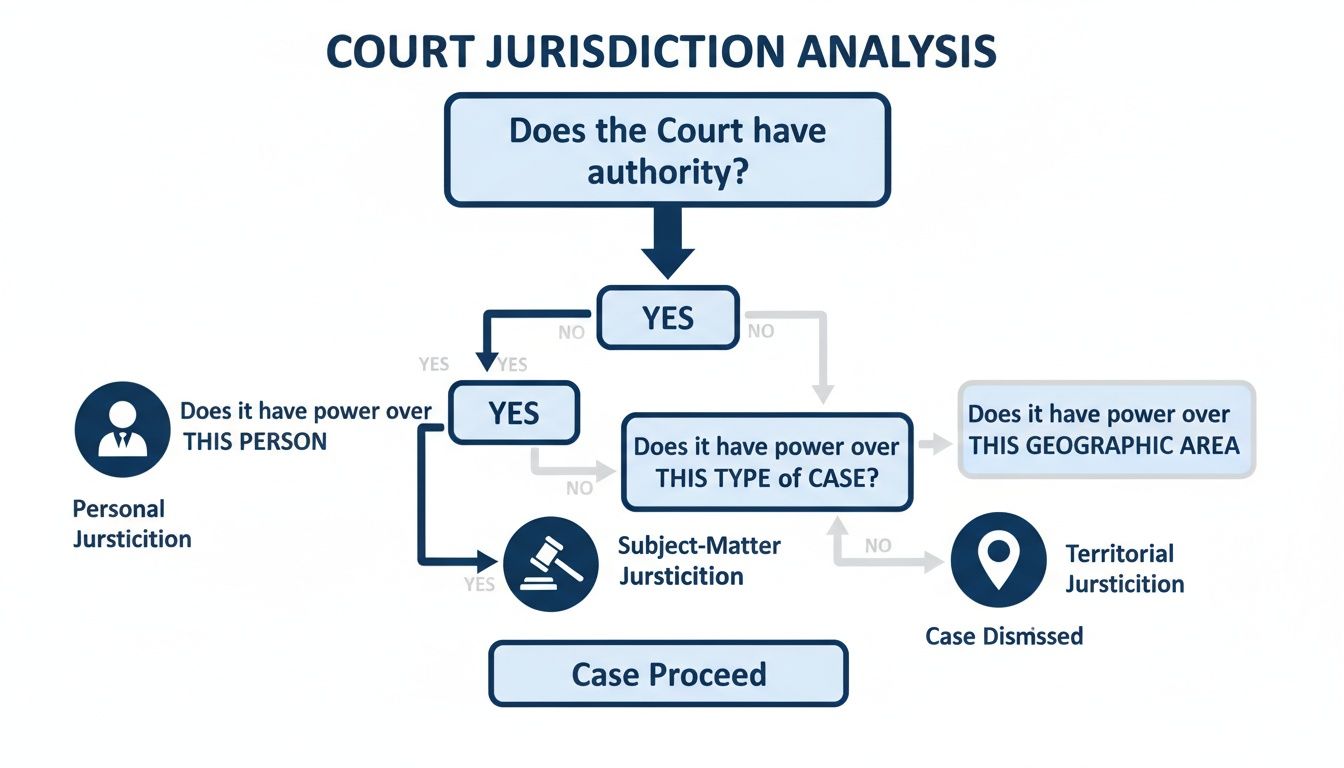 This flowchart breaks down exactly how a court analyzes its authority, walking through the essential questions of personal, subject-matter, and territorial jurisdiction.